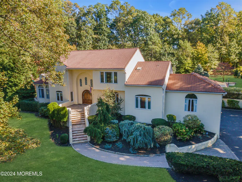 Nestled high on a hill in the prestigious Windswept Woods Part of Holmdel, this unique 5-bedroom, 5.5-bathroom Mediterranean-style cement stucco home with red roof tiles offers luxurious living and breathtaking views. Upon entering through custom double doors, you're greeted by over an impressive 20-foot, two-story grand foyer with a curved staircase and marble floors. The first floor features 10+ feet ceilings, a private office, a living room, a game room adorned with custom plantation shutters, 2 wood-burning stone fireplaces, exposed beam ceilings, and more elegant marble flooring. The Mediterranean-inspired kitchen is a chef's dream, boasting granite countertops, travertine tile, custom cabinetry, recessed lighting, a custom-built refrigerator, built-in wine rack, and a wine refrigerator. The family room doubles as a custom billiard room, complete with built-in entertainment. A private in-law suite with a full stone bathroom is also located on the first floor. Upstairs, you'll find 9+ feet ceilings, four spacious bedrooms with gorgeous hardwood floors, including a luxurious primary suite with stunning views, a bonus closet with a washer and dryer, and a spa-like primary bath featuring a standalone soaking tub, steam shower, double vanities, and an additional storage room. The partially finished basement offers additional office/nanny's suite space with a full bathroom, while the exterior is a true entertainer's paradise with a travertine stone patio, outdoor built-in grills, salt-water heated gunite pool, and a private, tree-lined yard that spans just under 2 acres. The property also includes a 3-car garage and comes with a full one-year home warranty. Located in a top-rated school district, this home offers the perfect blend of style, comfort, and convenience.